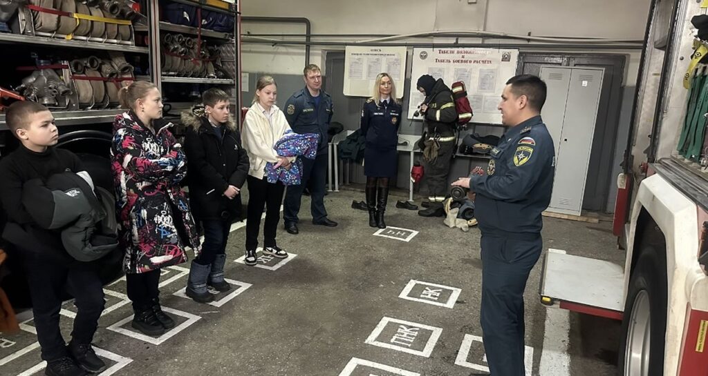 Командир отделения Айдар Габбасов провел ребятам экскурсию по зданию пожарной части. Показал караульные помещения, дежурно-диспетчерский пункт и помещение для отдыха.